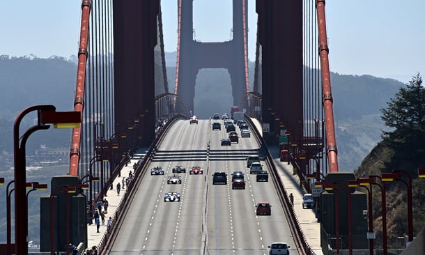 Indy cars drive Golden Gate Bridge Photos