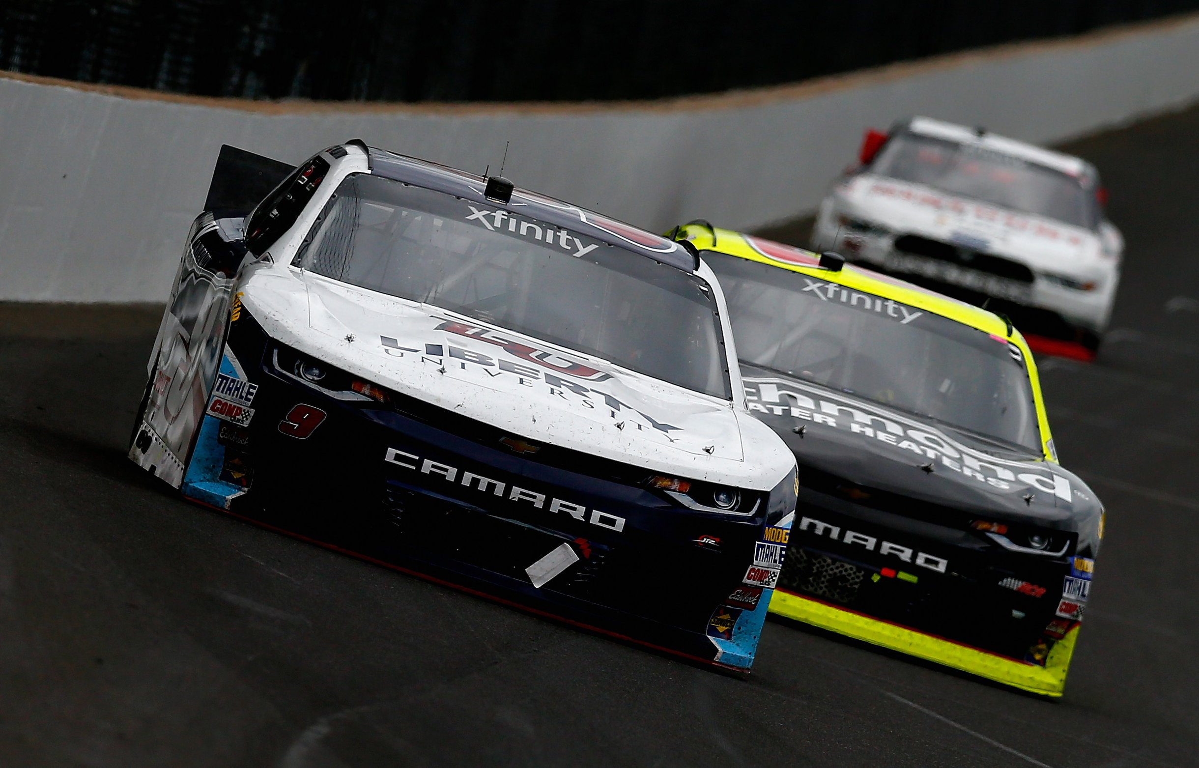 6 to go, Kyle Busch wants the lead back. Busch looks low on Allgaier, he’s there. They touch on exit. The side drafts slow both cars down, that pulls William Byron into the race for the lead. Busch stalls out, Byron makes it 3 wide for the lead. Byron takes 2nd, Allgaier continues to lead. The next lap, Busch to the outside, he’s back around Byron!
