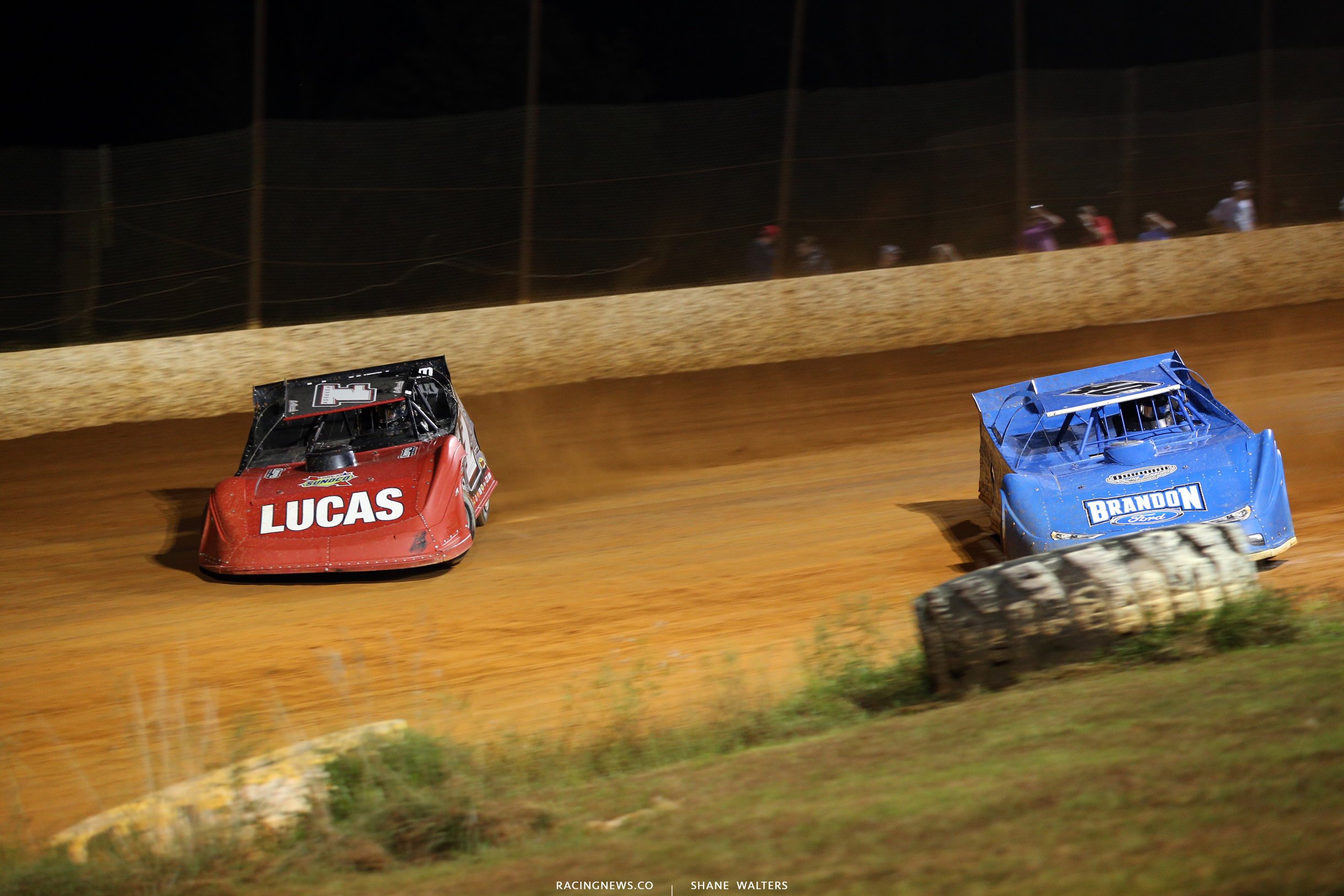 Lap 3, English drives it hard to the bottom in turn 3. It’s a slider but he only pulls even with the leader. Both cars run up the hill as Richards makes room for the slider. They run even off turn 4. Richards holds the lead into turn 1.