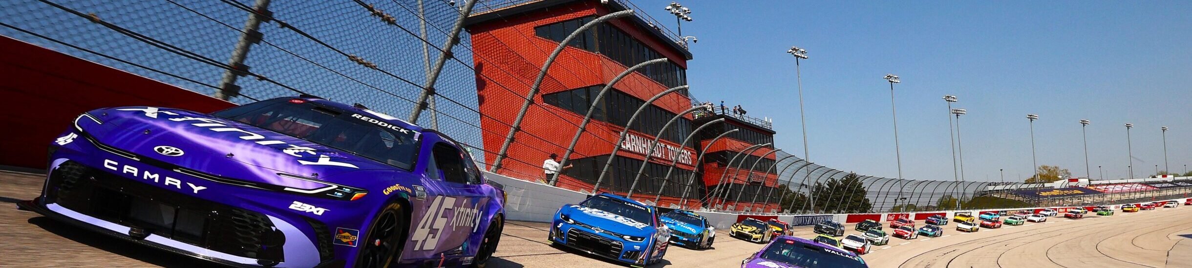 Green flag, Reddick and Wallace run door-to-door for the lead. Reddick finally clears him via the outside lane off turn four.